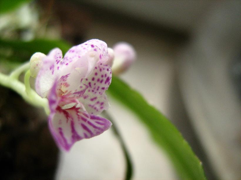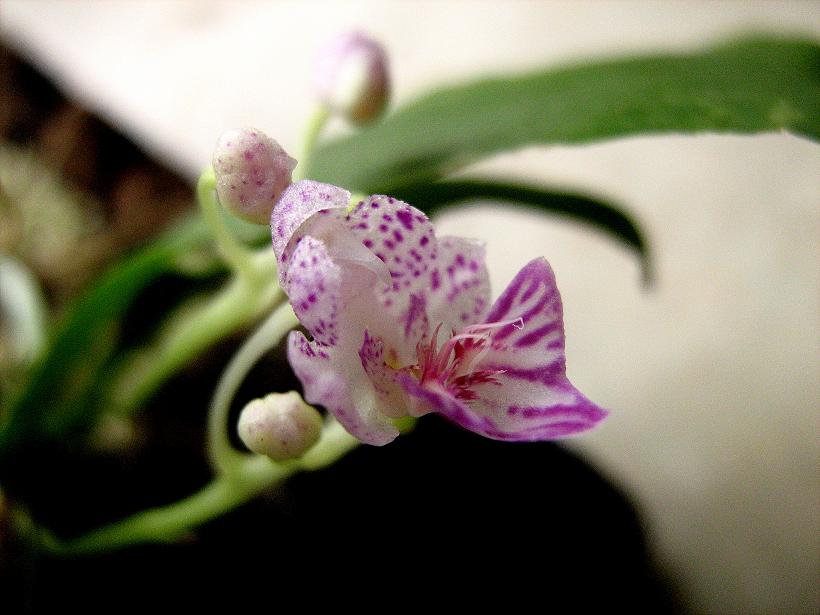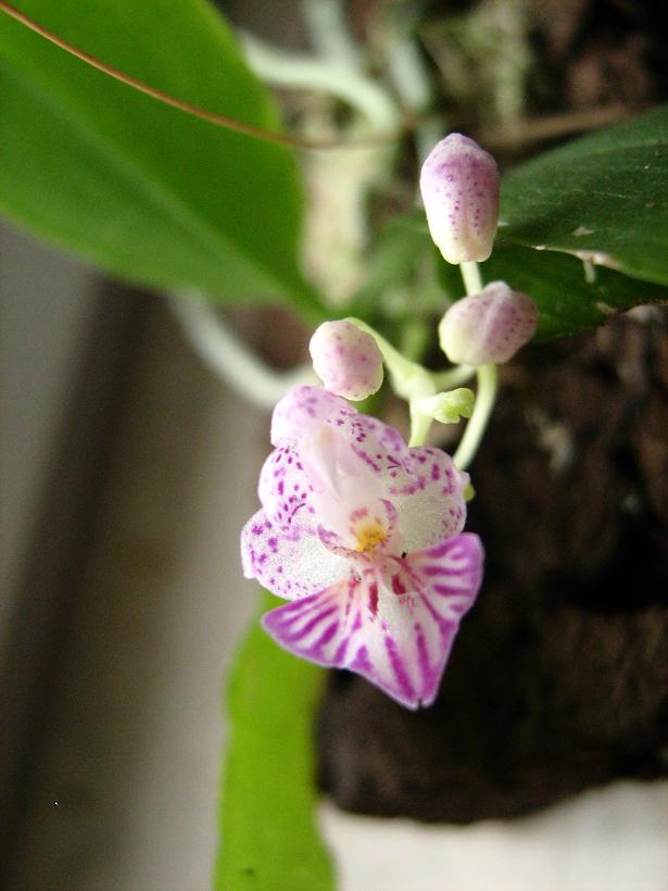 Mam go dosyć krótko dla tego kwitnienie to pewnie nie moja zasługa. Jednak cieszy bardzo, ponieważ kiedy do mnie dotarł miał cechy wyraźnego odwodnienia i groziło mu padnięcie. Okazał się małym twardzielem Szybko się zregenerował w orchidarium - wypuścił nowy listek i masę korzeni i ku mojemu wielkiemu zdziwieniu 2 pędy kwiatowe Natomiast 2 tygodnie temu otworzył się pierwszy pączek na jednym z pędów, kolejne są w drodze Zapowiada się długie kwitnienie