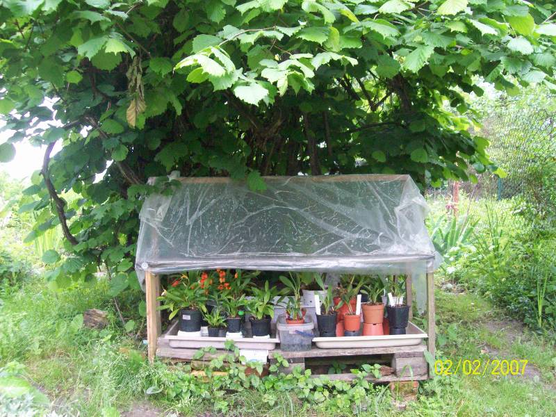 Domek stoi pod leszczyną odwrócony do strony pn.- wsch.Ma już kilka lat i trzeba pomyśleć o czymś większym.Daszek to ochrona przed gradem.