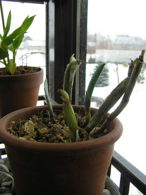Wyjęłam z plastikowej doniczki i zobaczyłam, że długie korzenie są zupełnie czarne. Obcięłam je wszystkie, jak również żółto-brązowe zasychające liście. Zostały zaledwie dwa liście i kilka starych odwodnionych, patykowatych pseudobulw.
