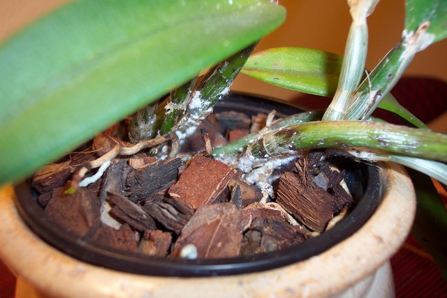 Wydaje mi się, że Pana roślina jest opanowana przez wełnowce. Proszę obejrzeć ją przez lupę i porównać ze zdjęciami w Internecie. Mnóstwo zdjęć wyskoczy, gdy wpisze Pan do wyszukiwarki grafiki "mealybug" albo "Pseudococcus". Jeżeli moje przypuszczenia się potwiedzą, to trzeba działać szybko, bo szkodniki są już mocno rozpanoszone. Roślinę wyjąć z podłożą, namoczyć całą na kwadrans, pół godz. w roztworze środka przeciw wełnowcom np. actellic, confidor, mospilan. Potem przesadzić w świeże podłoże. Można też nie przesadzać, tylko zastosować oprysk, a podłoże z korzeniami zalać roztworem na kwadrans, pół godz. Po 2 tyg. opryskać roztworem któregoś z ww. środków owadobójczych. Dla pewności można zastosować jeszcze jeden oprysk po kolejnych dwóch tygodniach.