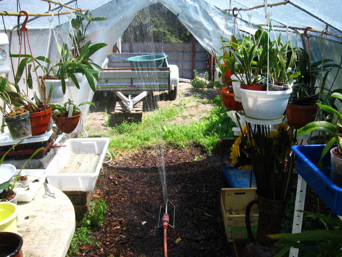 Po drugie, zamiast mini-nawilżaczy ultradźwiękowych, które nadają się do mieszkania lub orchidarium ale nie do szklarni, zastosowałbym profesjonalne zamgławiacze lub zraszacze. To wcale nie jest żaden horrendalny wydatek - pojedyncza głowica rozbryzgowa z antykapaczem kosztuje kilkanaście złotych (potrzeba by ze 4-6 sztuk, może być i więcej), do tego kilka metrów węża (kilkadziesiąt złotych) plus pompa wodna dająca ciśnienie 3-4 atmosfery (120 złotych w OBI) plus beczka plastikowa na deszczówkę za 50 zł. Łącznie ze 300 zł i dwie godziny pracy. Jeśli woda z wodociągu jest odpowiedniej jakości, nie trzeba nawet beczki.