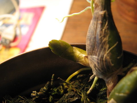Powracam po prawie 2 latach z moją meduzą Ma się dobrze i właśnie zaczęła wypuszczać coś czego nie mogę jednoznacznie zidentyfikować tzn. nowy przyrost czy pęd kwiatowy. Proszę bardziej doświadczonych z tym storczykiem o rozwianie moich wątpliwości.