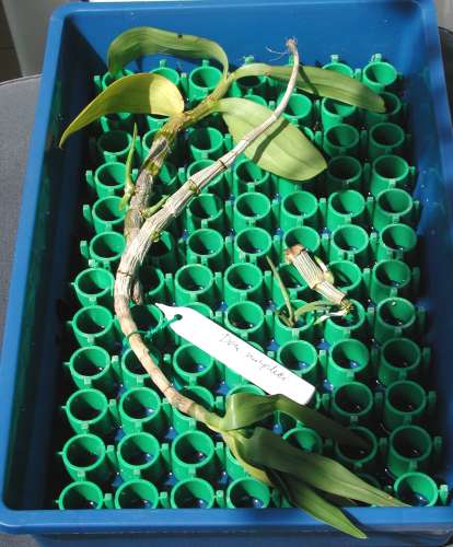 Mam u siebie plastikową szklarenkę, czyli pudło z pokrywą i kratką na dnie, gdzie wrzucam jakieś ułamane kawałki pseudobulw np. dendrobiów (nadzieja na keiki), albo inne malizny do reanimacji. Na dnie w pudle jest woda, więc wilgotność może być nawet 100%, jeśli przysłoni się otworki wentylacyjne. Aktualnie leży tam parę kawałków...