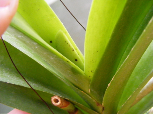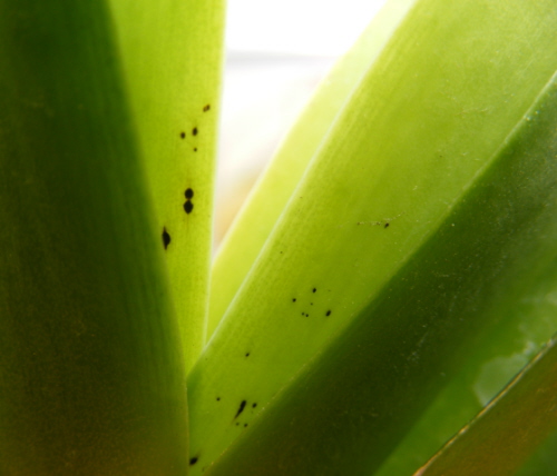Kilka dni temu zauważyłem, że na najmlodszych liściach pojawiają się drobne (ok 1 mm, nie rozrastają sie póki co), czarne plamki. Nie są wklęsłe. Nic z nich nie wycieka. Caly "rdzeń", z ktorego wyrastają liście jest na razie czysty i zdrowy.
