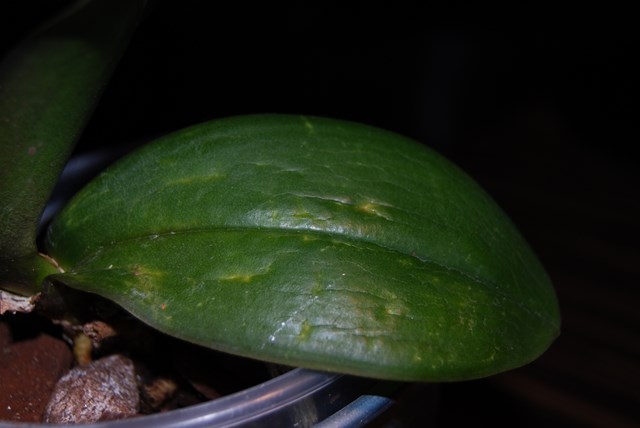 Mnie to wygląda na ślady po wcześniejszym mocnym przesuszeniu. Mam właśnie na stanie hybrydkę z bardzo podobnymi zmianami, którą chcieli ususzyć w sklepie. Na skutek braku wody liść się marszczy, tworzy się taka siatka zmarszczek, zagłębień i tam, gdzie są najmocniejsze, tkanka obumiera, stąd żółte plamy, a potem mogą powstać całe obumarłe miejsca, z czasem zasychające, do czego tu nie doszło. Po podlaniu mniejsze bruzdy znikają, a głębsze uszkodzenia już nie.