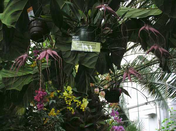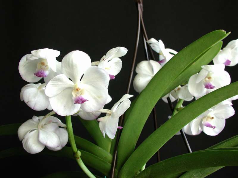 Ma dwa pędy kwiatowe, jest ulokowana w wiszącej doniczne z wilgotnym mchem i ma piękne, wystające, grube korzenie.