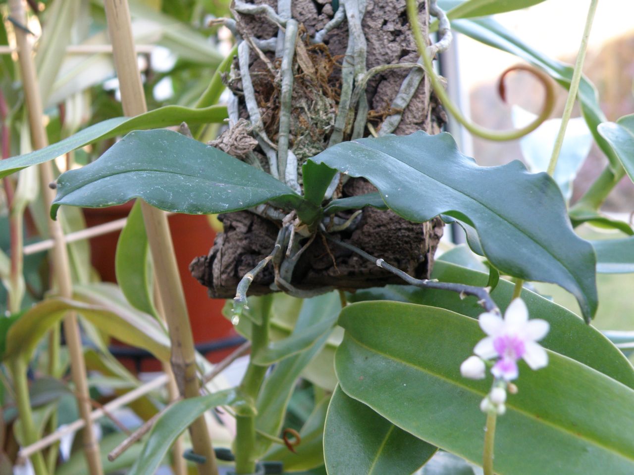 Posadzona jest na podkładce drewnianej bez dodatków typu mech. Korzenie są grube, płaskie. Przed każdym nowym kwitnieniem gubiła liście. Pęd kwiatowy w moim przypadku bardzo pomału się rozwija i dojrzewa do kwitnienia. Zawsze jest schowany pod bardzo ciemno zielonym liściem. Pojawia się w stożku wzrostu liść a później pęd kwiatowy i rosną sobie razem. Nigdy nie miałam więcej niż trzy liście.