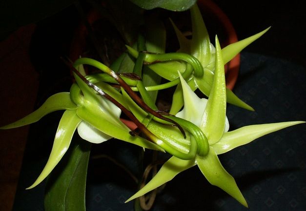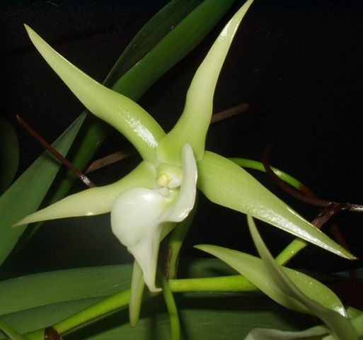 Jak to u Angraeców bywa kwiat ma kształt gwiazdy, jest duży woskowaty i wieczorami słodko pachnie