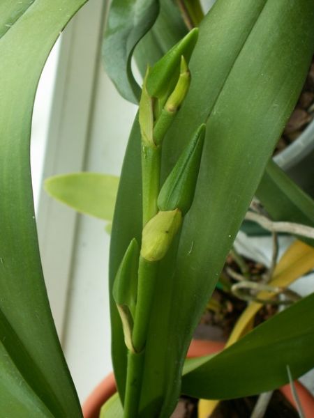 Lato spędziła na dworze, postawiona bezpośrednio na ziemi bo zapomniałam o podstawce, w efekcie na jesień wyciagnęłam z ziemi piękne dwa długie korzenie ... Szybko po przyniesieniu do domu zauważyłam wyłaniający się pęd kwiatowy. Tylko trzy pąki (choć mogło być więcej ) ale za to jakie ...