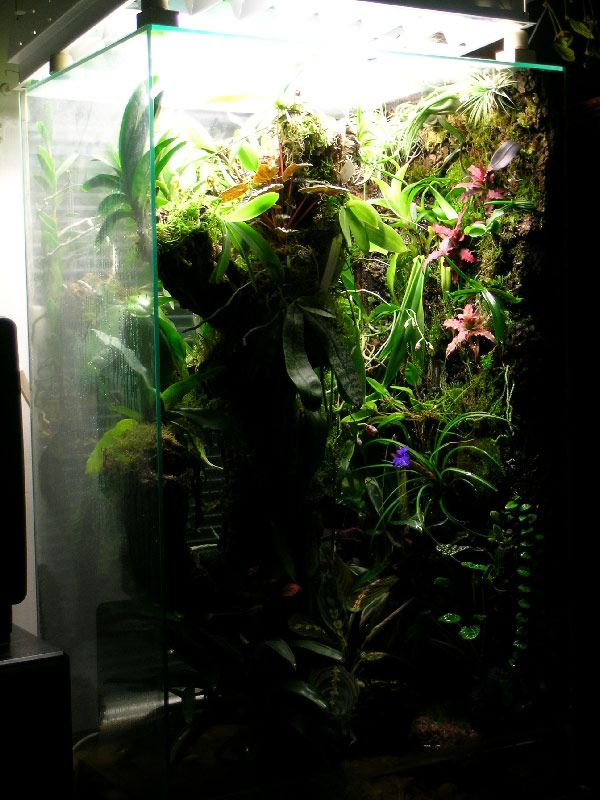 Wszystko jest deszczowane codziennie, także codziennie jest włączana kaskada na tej bocznej ścianie po prawej. Na początku myślałem, że to za dużo wody, ale storczyki mają się świetnie, a nawet lepiej. Tylko w dolnej części (gdzie jest mniej światła i bardziej mokro) storczyki odmawiają współpracy, ale mech rośnie najlepiej.