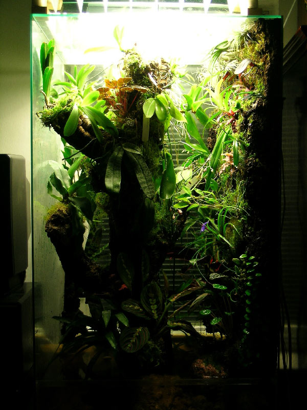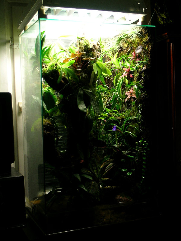 Co do zacienienia dolnej części - to jest normalne - intensywność światła maleje proporcjonalnie do KWADRATU odległości od źródła! My nie widzimy tego zwykle gołym okiem, ale aparat fotograficzny już tak. Czyli o ile 10 cm od lampy jest ze 30 000 luksów, to na dnie jest zaledwie 100. Dlatego trzeba albo zrezygnować z uprawy storczyków w dolnej części (ja tak zrobiłem - są tam tylko nie-storczyki o niewielkich wymaganiach świetlnych, paprocie i mchy) albo doświetlać też dół dodatkowymi lampami (tak mam w drugim orchidarium). Można też budować orchidaria o odwrotnych proporcjach - płaskie i szerokie.