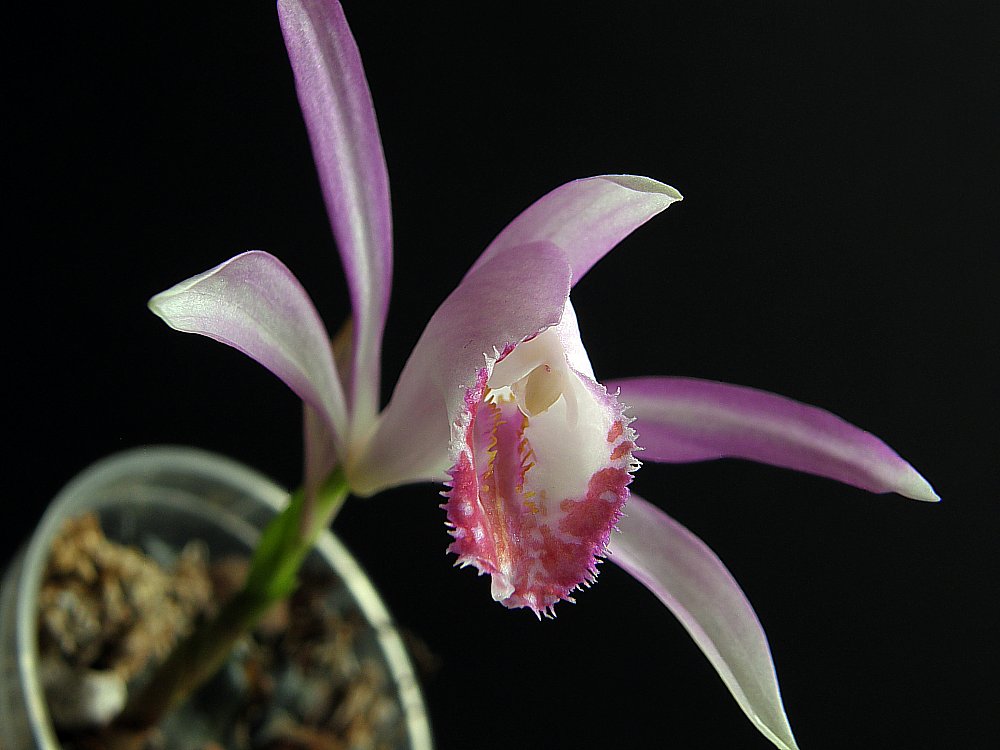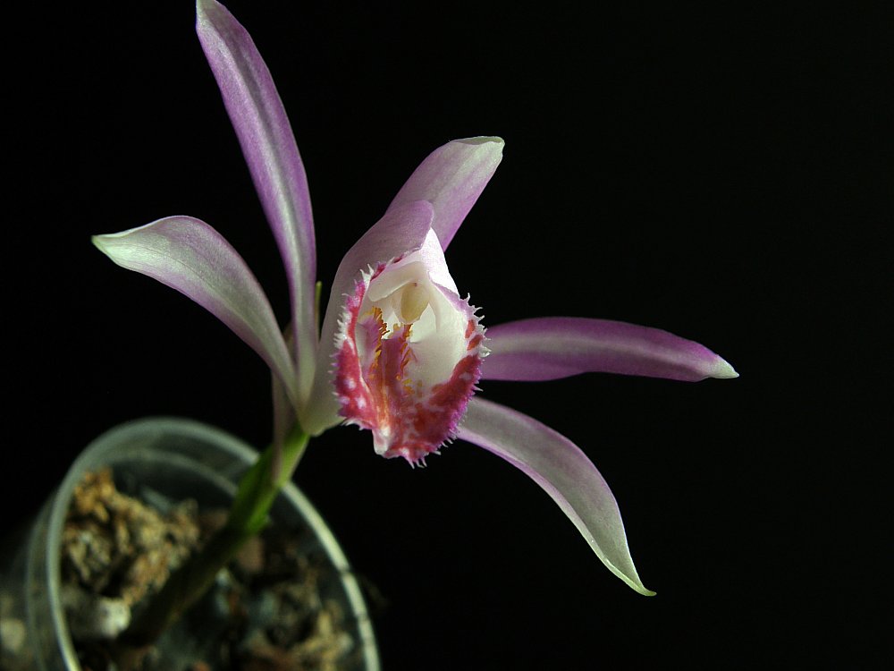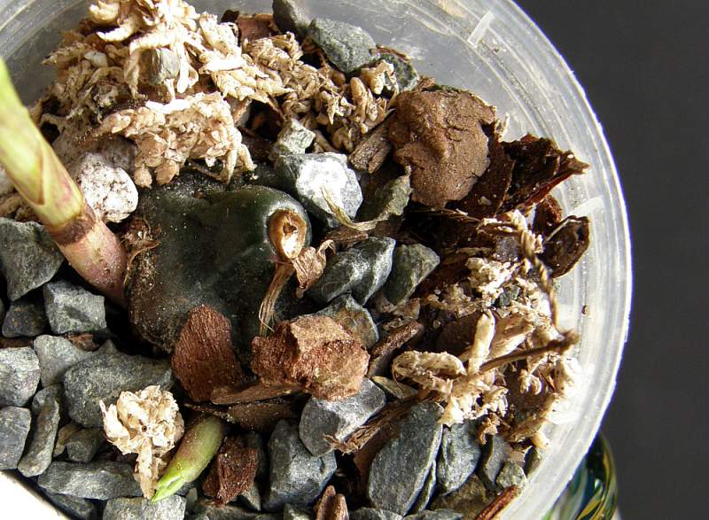 Jak to Pleione, gubi na zimę liście i wtedy wymaga chłodu (do 10oC) i zaprzestania podlewania. Moje Pleione zimę spędziły w pojedynczych, w większości, doniczkach ustawionych w sporym pudle, nad wodą, w plastikowej szklarence, blisko nieszczelnych drzwi balkonowych, przy temperaturze nie przekraczającej w dzień 15oC, a w nocy...znacznie mniej.