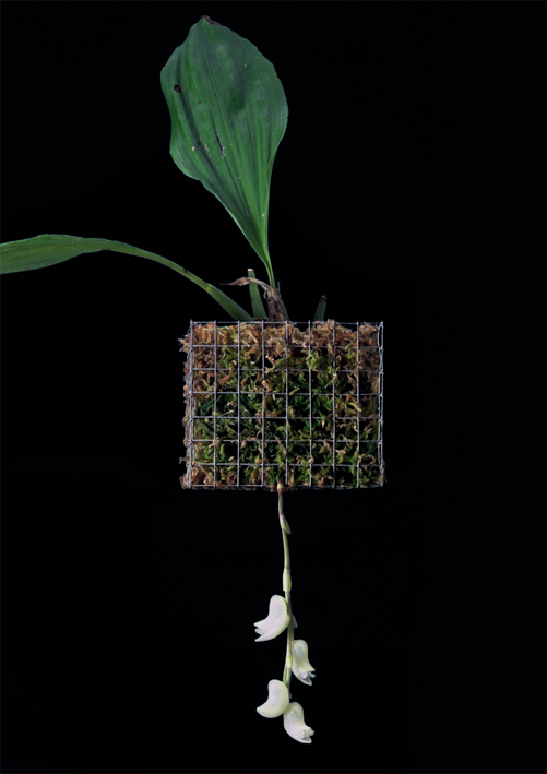W praktyce wygląda to trochę inaczej. W prawdzie storczyk bez problemu rośnie zawieszony we wschodnim oknie bez dodatkowego nawilżania powietrza, jednak kwiaty wymagają dodatkowego nawilżania (nawilżacz ultradźwiękowy). W przeciwnym razie zasychają końce płatków. Nie wiem, w jakim stopniu toleruje wysokie temperatury latem (uprawiam od września), ale zimą 25 C w ciągu dnia i 15 C w nocy wydaje się być odpowiednim przedziałem. Podczas kwitnienia zdecydowanie potrzebuje dużo rozproszonego światła, znacznie więcej niż podczas polskiej zimy. Pomimo wysokiej wilgotności oraz zastosowania nawozu z wysoką zawartością fosforu i niską zawartością azotu kwiaty nie wykształciły się w pełni - otworzyły się tylko częściowo, purpurowe cętki było słabo wybarwione, zapach był wyczuwalny tylko z bardzo bliskiej odległości. Przypuszczam, że to właśnie brak słońca. Niektórzy hodowcy zalecają światło prawie tak silne jak dla Cattleya. Storczyk rośnie w czystym sphagnum, w drucianym koszyku. Obecnie wypuszcza nową pseudobulwę.
