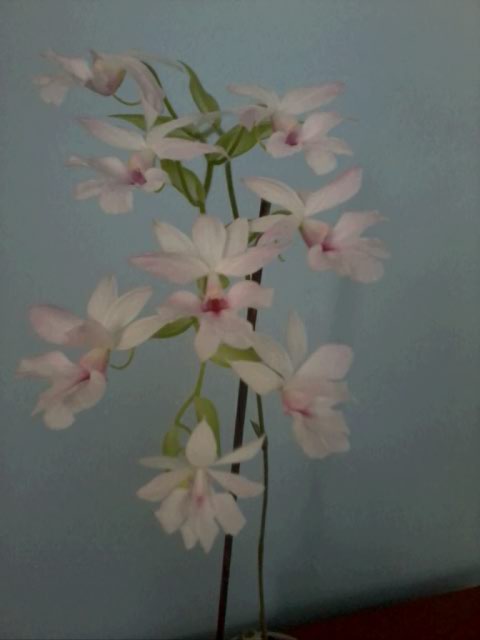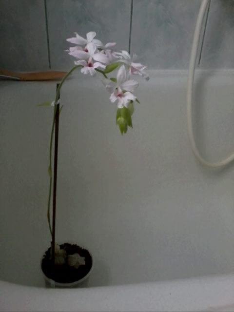 Roślina zakupiona od pani Kasi Lis wiosną zeszłego roku-była to jedna stara pseudobulwa z młodym przyrostem. Storczyk powędrował do łazienki z oknem o wystawie północno-wschodniej. Podlewany sporadycznie (czasem miał sucho jak na pustyni i to przez dłuższy czas) i prawie nienawożony, na początku grudnia wydał pęd kwiatostanowy, który powolutku rosnąc, rozwinął pierwszy kwiat w połowie stycznia. Zdjęcia (kiepskie, bo robione telefonem) nie oddają nawet w części subtelności kwiatów w najbledszym z odcieni różu. Polecam!