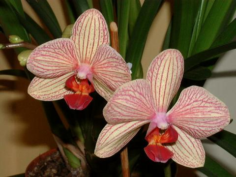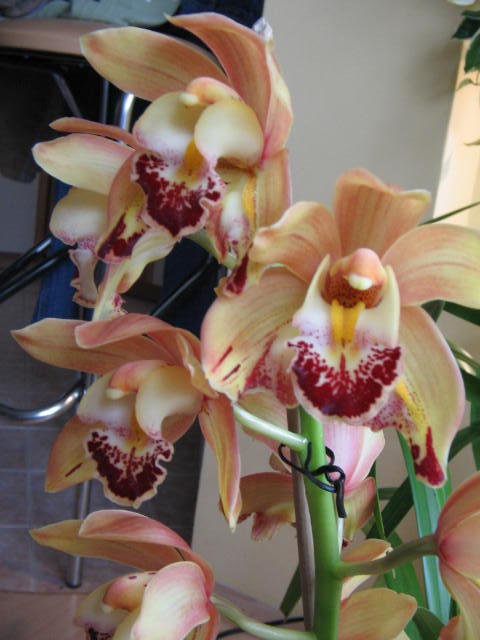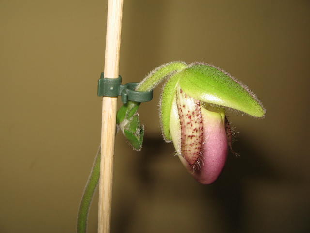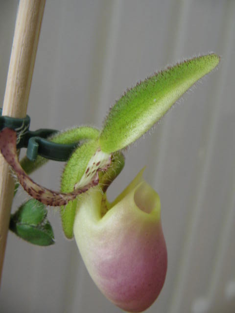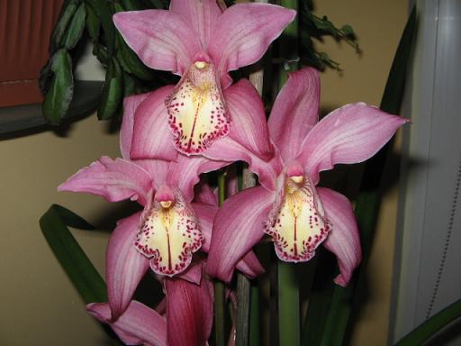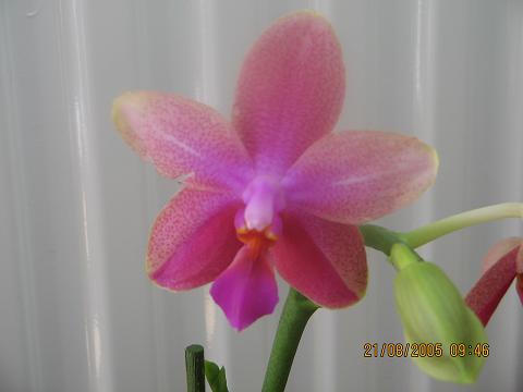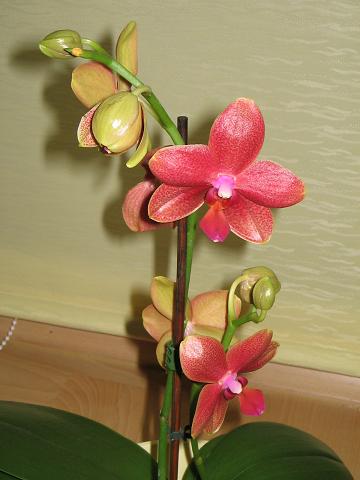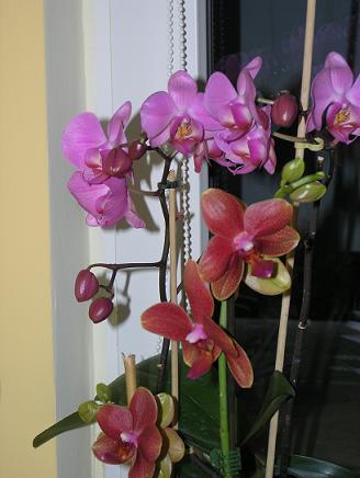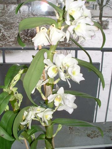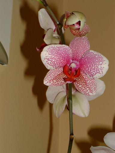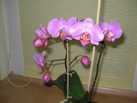 Stało ono przez całe lato na balkonie też w słonecznym miejscu, było podlewane zaraz po przeschnięciu podłoża, nawożone przy każdym podlewaniu, jednak już od września do połowy pażdziernika zaprzestałam podlewać, póżniej w obawie o zbyt niskie temperatury na dworzu przeniosłam je do zimnego pokoju(jeszcze nie ogrzewanego kaloryferem) i nadal nie podlewałam.Gdy włączyli ogrzewanie nad kaloryferem ustawiłam moje falki a po drugiej stronie okna ustawiłam te roślinki które muszą mieć chlodno i dodatkowo po tej stronie poluzowałam delikatnie okno by bardziej schłodzić tą częśc parapetu, tu właśnie stoi moje dendrobium i chłodzi się do oporu, choć w sumie już nie musi,gdyż wypustki już się uformowały i zaczyna wypuszczać pąki, ale nadal go nie podlewam tak mniej więcej do momentu aż pąki się dobrze uformują..